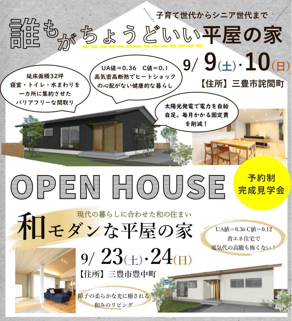 9月は2棟開催します! 平屋の家・予約制完成見学会のお知らせです!